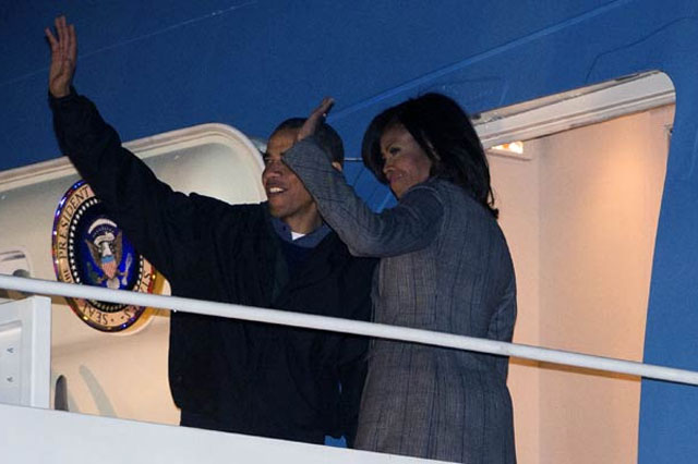 US President Barack Obama and First Lade Michelle Obama board Air Force Oneas they leave for India - Photo by AFP