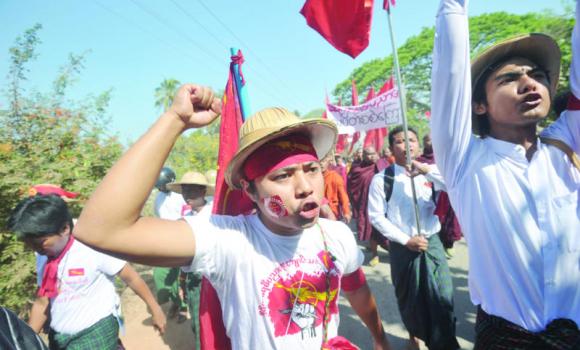 Their rally in Yangon held in solidarity with a rolling student demonstration calling for education reform comes as several groups of workers also staged strikes over pay.