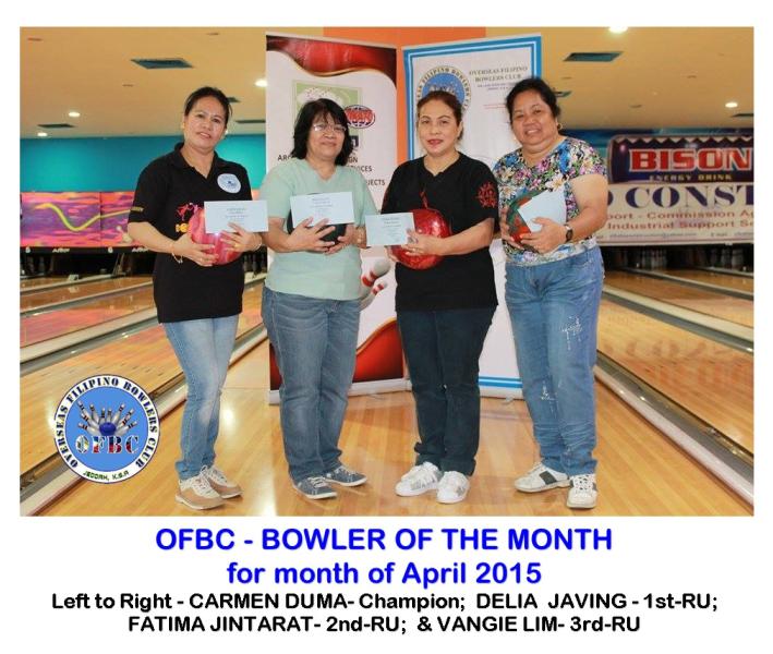Joining Pamintuan as the Bowler of the Month for April was Carmen Duma who became champion again after an interval of one month in the ladies division.