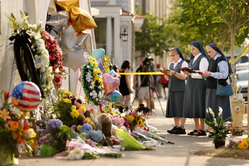 Area residents including a group of nuns filed past the historic church early Friday that was the site of Wednesday's shooting. Many tearfully offered prayers and left flowers near the line of yellow police tape behind which law enforcement agents continued to gather evidence.