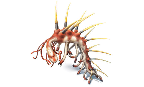 Hallucigenia 0.4 to 2.2 inches long (10-55 mm) possessed seven pairs of nail-like spines protruding from its back with an equal number of pairs of long flimsy legs underneath tipped with claws. There were three pairs of skinny tentacles toward the head perhaps used to process food or as antennae.