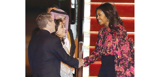 She reached at the Hamad International Airport at 6.45pm in a special plane. Ambassador Ibrahim Yousif Abdullah Fakhro Director of Protocol Ministry of Foreign Affairs and Dana Smith US ambassador to Qatar received Michelle on red carpet at the airport.