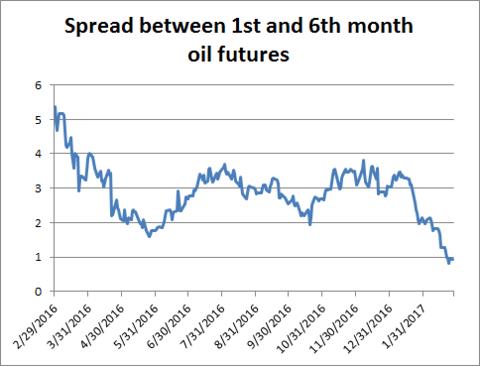 (MENAFN- Asia Times) The spread between oil for delivery 1 month and 6 months hence has collapsed during the past year as oil prices recover. Once oil hits the mid $50's, a great deal of shale capacity becomes profitable, and shale operators sell futures to hedge their earnings. That leaves oil in a range for the foreseeable future. — David Goldman