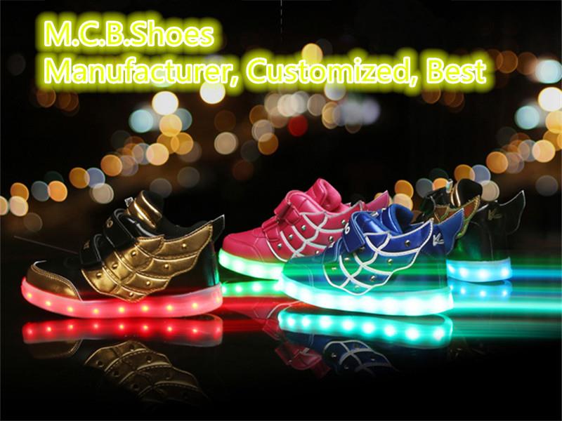 M.C.B. Shoes has over 17 different types of modern LED shoes for kids. These include the standard running shoes and sneakers. The company manufacturers fancy LED shoes for kids with wings such as: The luminous wings LED kids shoes, summer single round heelys light up trainers, black wings dance sneakers and multi-colors, among others.