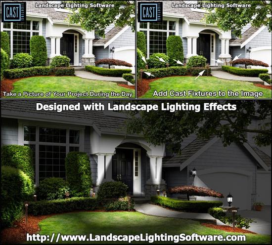 The Lighting Effects program allows you to show the potential client how the light from the Cast Lighting fixture will be projected at night. You can also adjust the shades of darkness showing early evening to way into the night.The programs are exclusively designed for landscapers, outdoor lightingcontractors and other professionals who want to show the spaces illuminated. The end result is a design that gives the homeowner or business owner a clear idea of what they are paying for, turning a potential client into a customer.