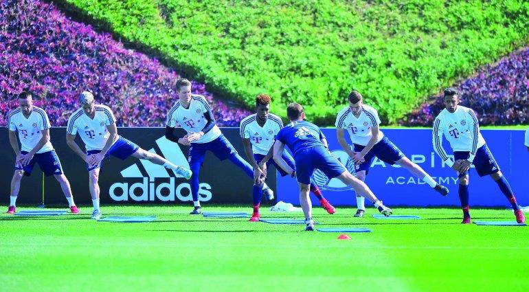 FC Bayern Munich players train during their Winter Training Camp at Aspire Zone yesterday. The 25-member squad team will train at Aspire Zone's 1 and 2 pitches, preparing for the second half of the season until Sunday, January 7.