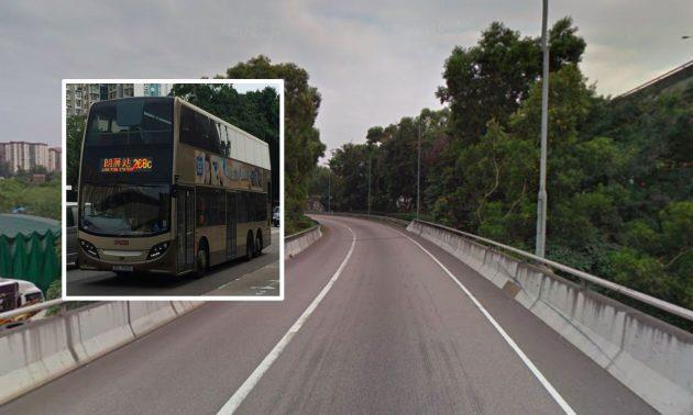 uploaded on Facebook showed footage from a dashboard camera on a vehicle behind KMB bus No. 268C on Tsing Kwai Highway near Mei Foo going down a slope into a curve then suddenly running into the fence on its right side.