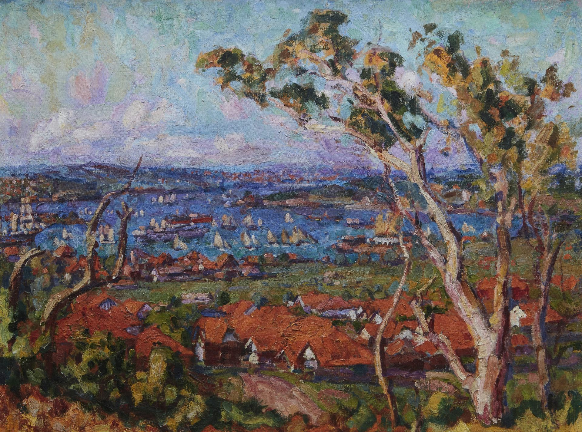 In 1921 Russell returned to Sydney, where after holding one exhibition at the Sydney Camera Circle, he ceased to exhibit. His last paintings of orange roofed bungalows overlooking the Harbour give the reason why. These modestly painterly works would have seemed extreme for a Sydney that only accepted modern art if it was smooth and flat.