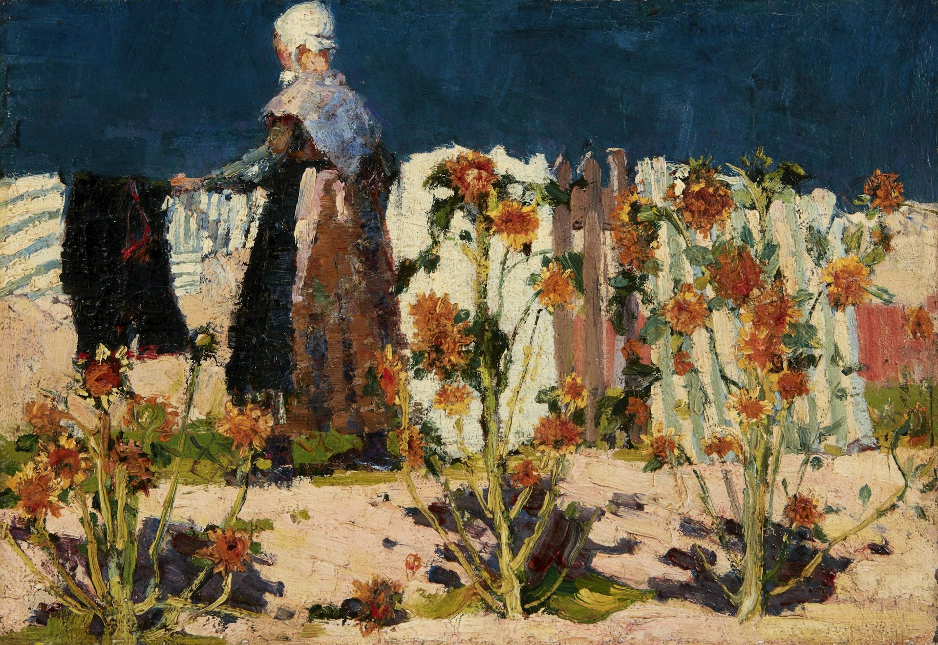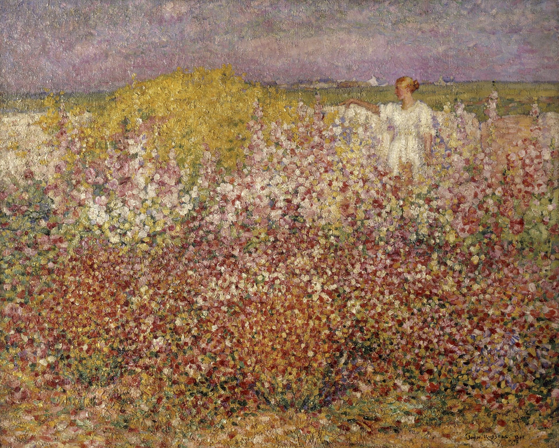 The turbulence of these works is contrasted with the luminous beauty of the landscapes he painted on visits to Antibes on the Riviera. Russell took great pleasure in the tranquil beauty of gardens, of flowers in season and the pattern of blossom. The last work in the exhibition, Mrs Russell among the flowers in the garden of Goulphar, Belle-Île 1907, shows a painstaking layering of a medley of colour as the field blossoms seem to move in homage to the one small, white-clad figure. At the time he was painting this Marianna was dying of cancer. He left Belle-Île soon after.