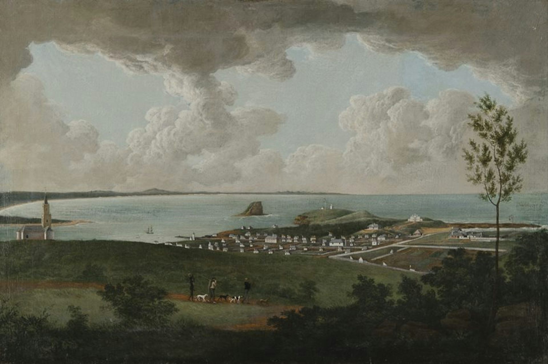 Lycett's Inner View of Newcastle (1818) depicts a settler, a convict and an Aboriginal man walking in single file with four kangaroo dogs (usually, greyhound, deerhound and wolfhound crossbreeds); the convict is carrying the carcass of a freshly killed kangaroo over his shoulder.