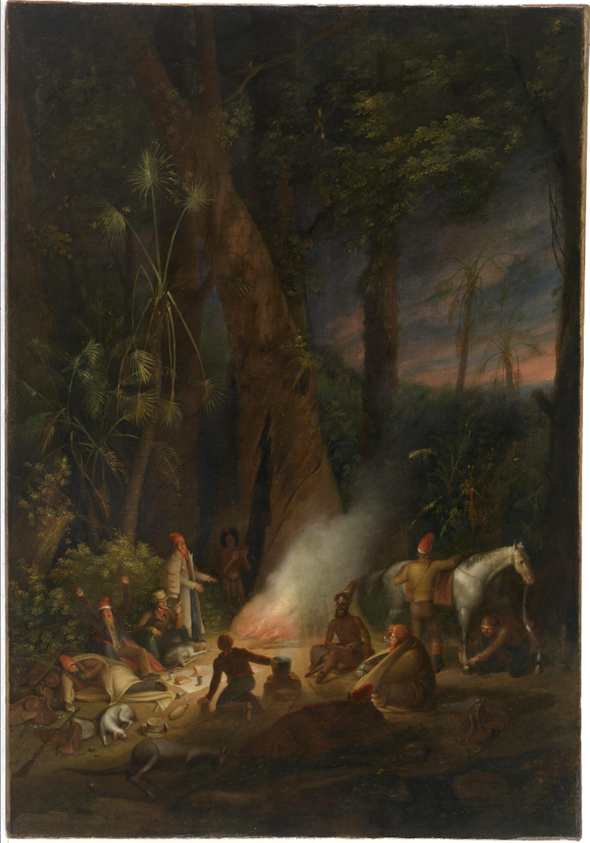 Augustus Earle was a freelance professional artist who had travelled around the world – with Charles Darwin, among others. He spent two and a half years in Australia in the mid-1820s, chronicling metropolitan and bush scenes. His painting A Bivouac of Travellers in Australia in a Cabbage Tree Forest, Day Break (1827) gives us an idyllic scene of Aboriginal and settler companionship in the wake of a kangaroo hunt.