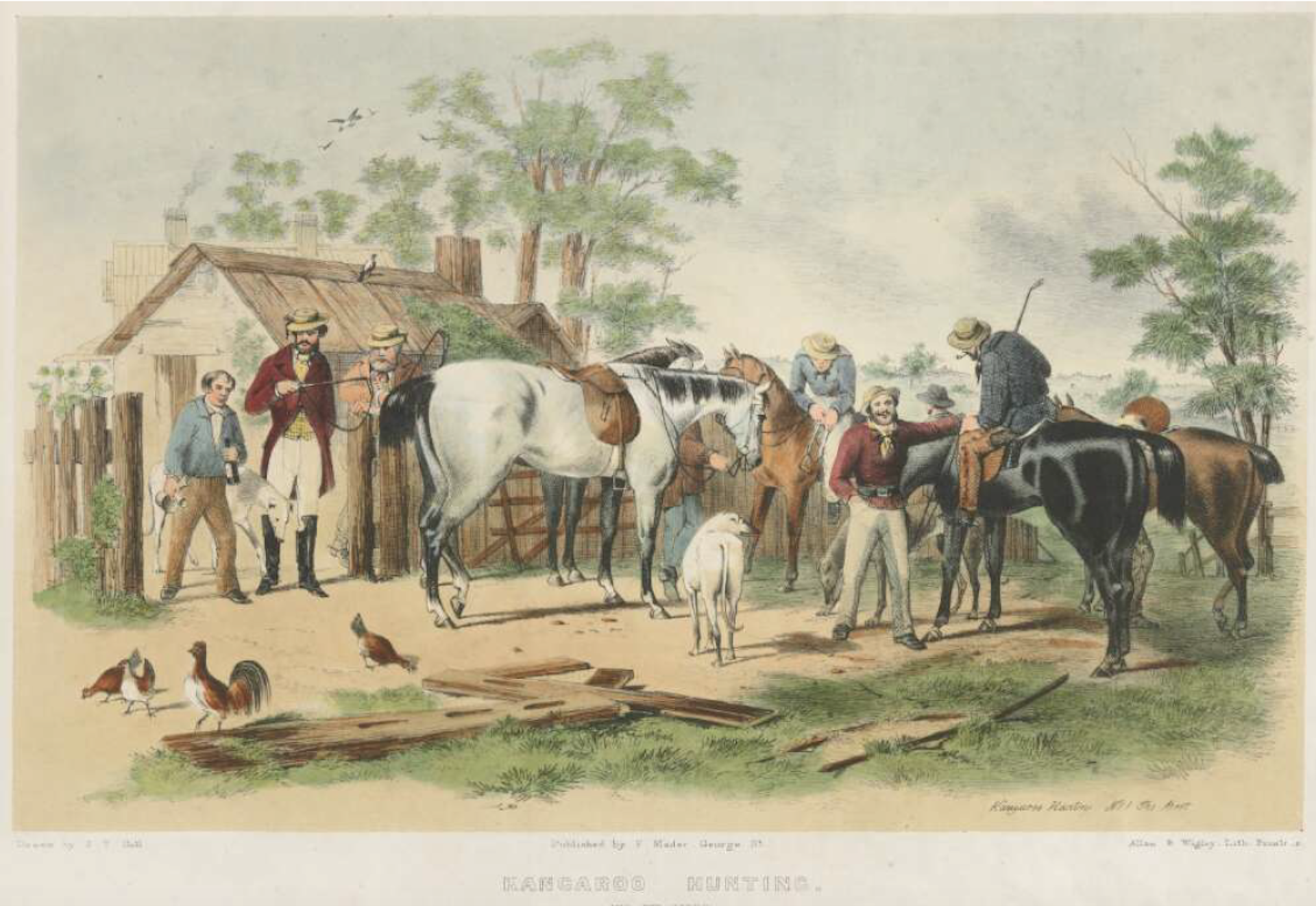 Gill was a prolific chronicler of colonial life; his Australian Sketchbook (1865) included one scene, Kangaroo Stalking, in which a settler with a gun and an Aboriginal man hunt kangaroos together. In 1858 he produced a series of three lithographs under the general title Kangaroo Hunting. The first, The Meet, shows a gathering of men outside a rustic colonial homestead, with their horses and dogs (and some chickens; and a magpie on the roof). One of them has the conspicuous trappings of a wealthy squatter, tall, commanding, elaborately styled in black riding boots, yellow waistcoat, and scarlet jacket.