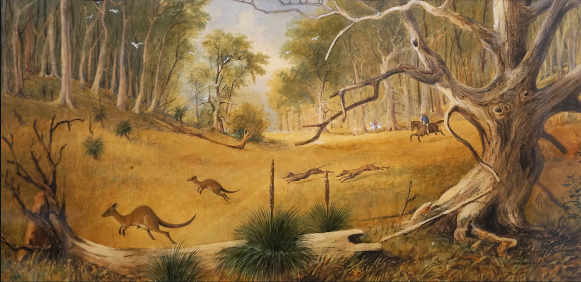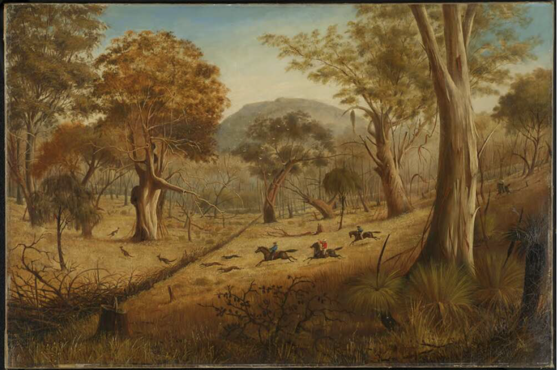 Sympathy for the kangarooEdward Roper was a keen naturalist and artist who travelled around the world, coming to Australia in 1857. His landscape A Kangaroo Hunt under Mount Zero, the Grampians (1880) has four hunters galloping through a woodland of eucalypts and grass trees, chasing three kangaroos. A long brushwood fence separates the hunters from their quarry. The riders and their hounds are approaching the fence at break-neck speed, highlighting the thrills and dangers of the chase; this is their land now, and they ride across it as a post-frontier expression of settler freedom and exhilaration.