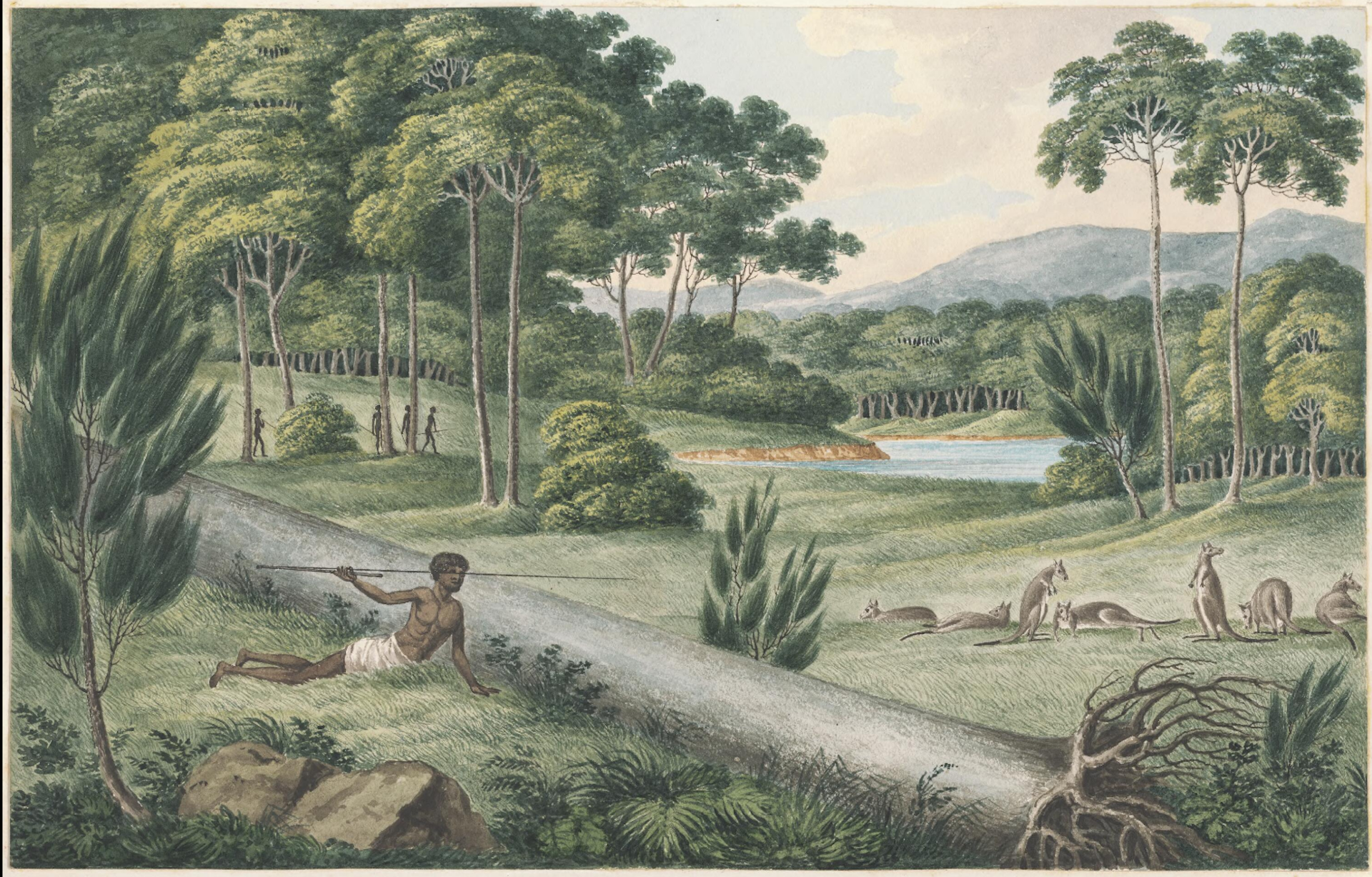 The kangaroo hunt quickly became a recognisable genre in colonial Australian art. Joseph Lycett was transported to New South Wales in 1813, a convicted forger. His Aborigines using fire to hunt kangaroo (c. 1817) and Aborigines hunting kangaroos (1820) give us two early examples of 'ethnographic' landscape painting where Aboriginal people hunt kangaroos in a fantasy precolonial space untouched by the impact of European settlement.