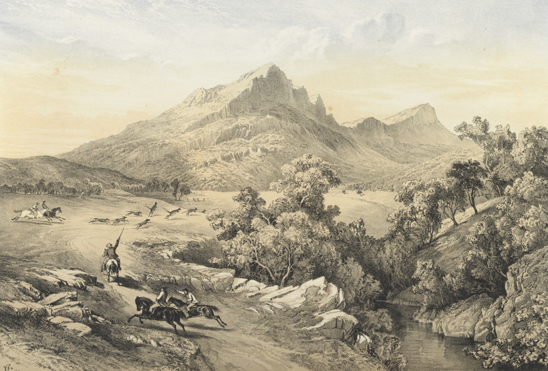 Mount Abrupt and The Grampians – produced the same year and published as a lithograph in Charles Troedel's The Melbourne Album – gives us the same perspective of this mountain. But now there is no Aboriginal family. Instead, a group of settler hunters and their hounds ride roughshod over the place this family had once occupied, chasing kangaroos. It is as if the hunt itself has erased any trace of Aboriginal occupation of land. Its depiction is an expression of settler triumph over both native species (the kangaroo will surely be killed) and Indigeneity (Aboriginal people have been dispossessed).