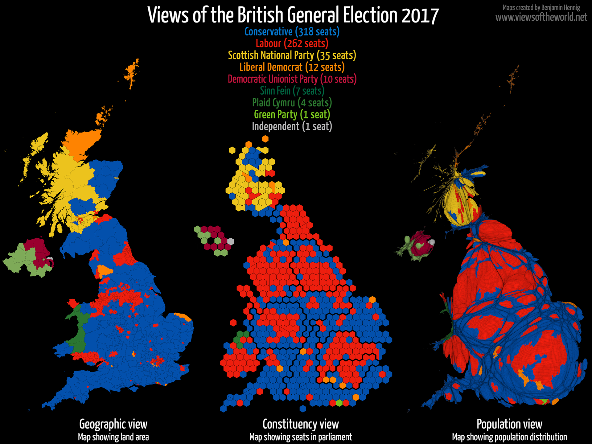 Hexagon-based maps used in parliamentary elections are another iconic example. Most viewers are not interested in the geographic area of each constituency, but do want to easily assess the total number of seats and which party has a majority.