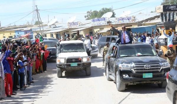 The president who is on a leading a large high powered delegation in a tour to the eastern regions dubbed Peace and Unity received a very warm welcome from residents of Erigavo adorned with national flag colours and waving wet twigs.