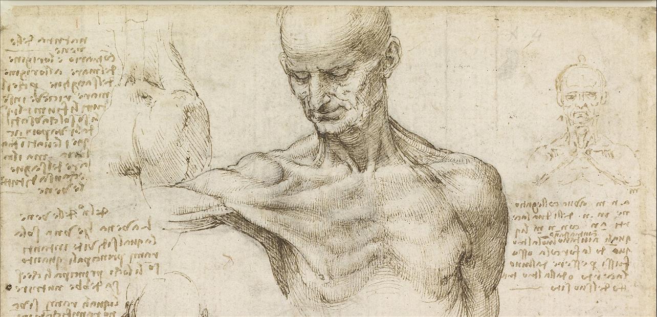 Superficial anatomy of the shoulder and neck, recto, c. 1510, Royal Collections, RCIN 919003, Google Art Project. Wikimedia CommonsAs he wrote: 'If you wish thoroughly to know the parts of man, anatomically, you – or your eye – require to see it from different aspects, considering it from below and from above and from its sides, turning it about and seeking the origin of each member.'