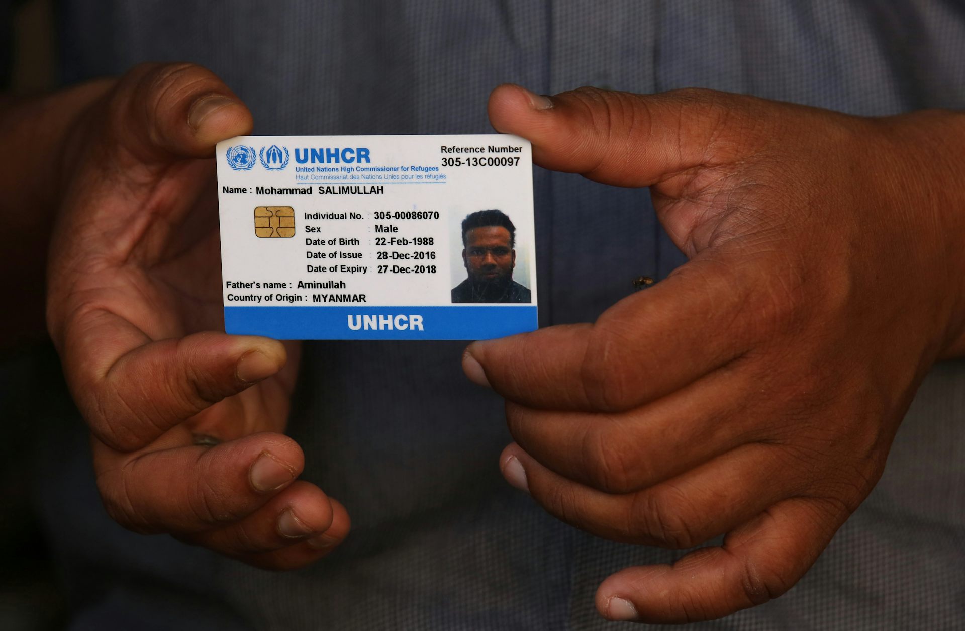A Rohingyaman shows his ID card given by the UNHCR in New Delhi, India.