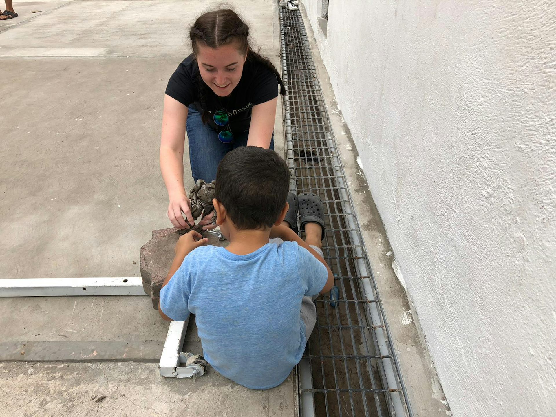 A little boy at a Mexico City migrant shelter converses with Laurier University student Madison Drost.