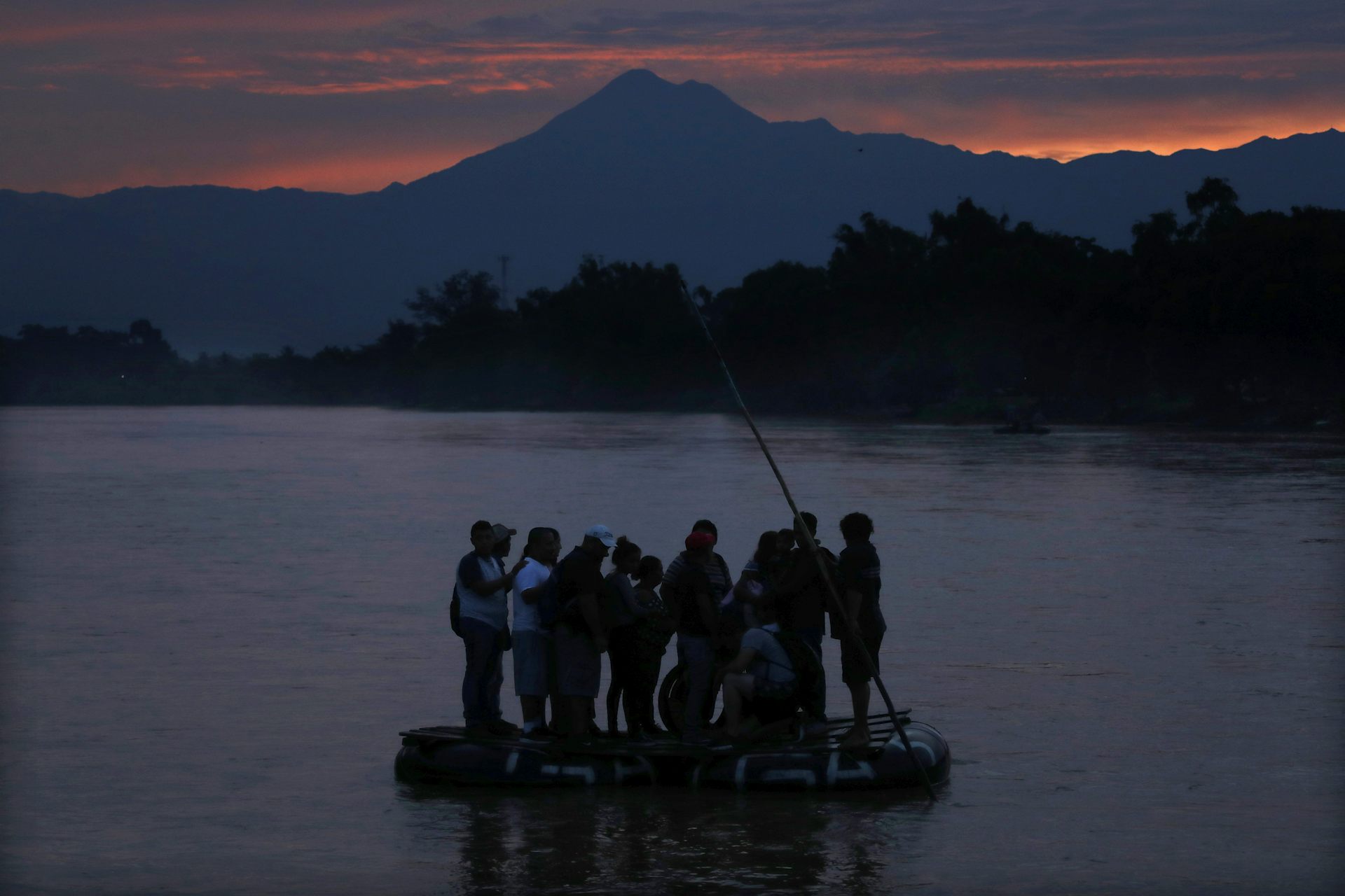 In this June 2019 photo, Central American migrants stand on a raft to cross the Suchiate River from Guatemala to Mexico.