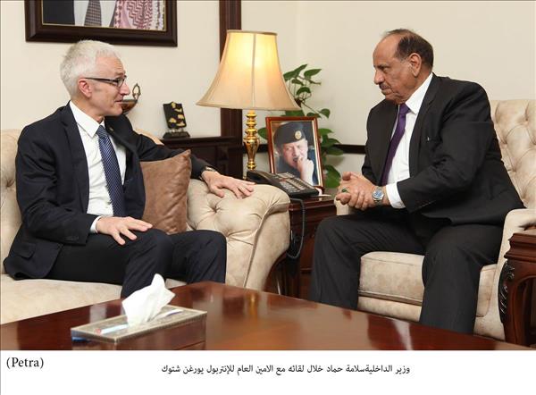 (MENAFN- Jordan News Agency) Amman, July 17 (Petra)- Interior Minister, Salameh Hammad, and Interpol Secretary General, Jurgen Stock, on Wednesday discussed means of bilateral cooperation and Jordan's efforts to improve international police cooperation and exchange of information to combat all forms of transnational organized crime.