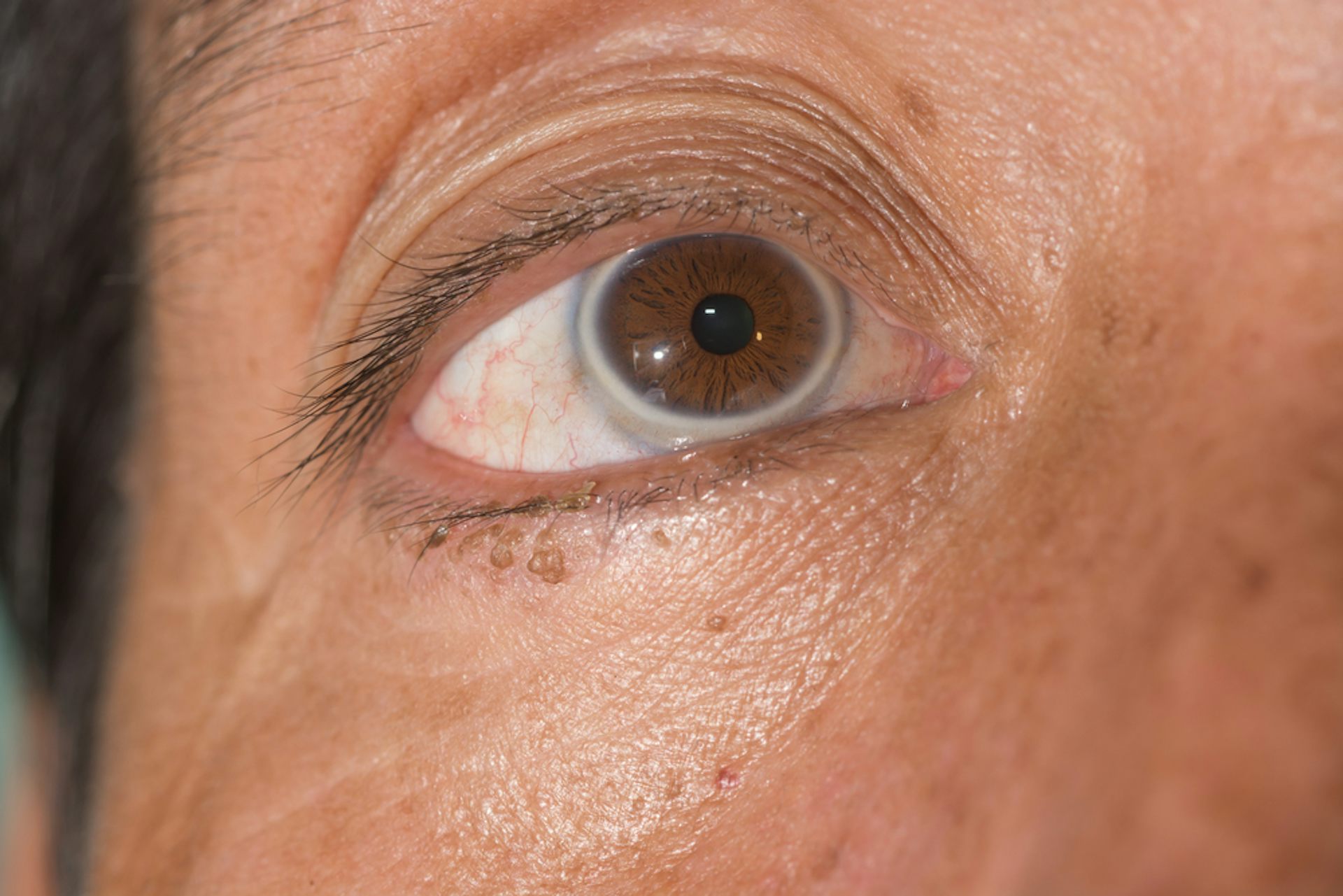 Fat deposits may also be seen in the eye, as a grey ring around the outside of the iris, the coloured part of the eye. This so-called 'arcus senilis', starts at the top and bottom of the iris before progressing to form a complete ring. It doesn't interfere with vision.