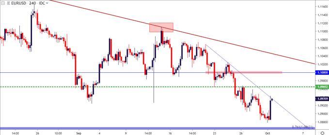 p-Going along with that pullback from two-year-highs in the US Dollar,EUR/USDhas bounced from fresh two-year-lows. The pair is currently testing trendline resistance, although this could still be a difficult place to stage bearish approaches on the pair. Potentially more attractive is a prior area of support/resistance around 1.0965 that could allow for stops north of the 1.1000 handle.EUR/USD Four-Hour Price Chart