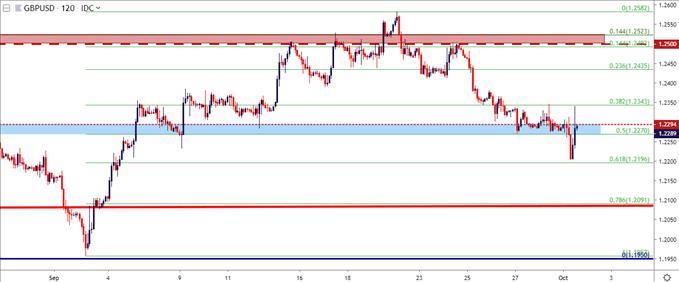 p-I followed the long side ofGBP/USDthroughout September and the pair showed breakdown during this morning's European session. Price action has bounced and resistance is now showing in that prior zone of support.GBP/USD Two-Hour Price Chart-p