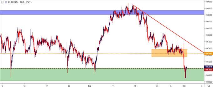 p-On the long side of the US Dollar,AUD/USDremains attractive. I had looked at the short-side of the pair over the past few weeks and prices pushed down below the .6700 handle last night. At this point, resistance potential lurks at the 'flash crash' swing low from earlier this year, taken from around .6743 on the chart.AUD/USD Two-Hour Price Chart