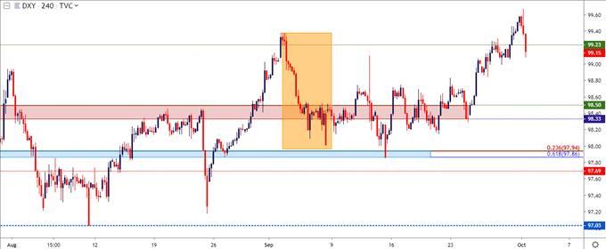 p-Its been a strong contrarian move to start Q4 across FX markets. The US Dollar rode a full wave of strength in the final week of Q3 to push up to fresh two-year-highs as looked at in this morning's piece. But a manufacturing ISM print that was released earlier today printed in contraction territory for the second consecutive month, likely owed toUSD -strength hitting US manufacturing, and this started a strong sell-off in the US Dollar. That theme hastened shortly after when President Trump remarked on the Fed being out-of-touch on the matter, allowing the US Dollar to get strong while most other developed economies are actively driving weakness into their own currencies.Perhaps most interesting has been the reaction in US equities. The bullish trend there stalled after the Fed's second rate cut of 2019 in September. As I had looked at a couple of weeks ago, topside no longer looked as attractive and since then the short-side swing has filled in fairly well. In this webinar, I looked at setups across the US Dollar in the attempt of deducing which currency pairs may be most attractive for themes of both USD-strength and USD-weakness.
