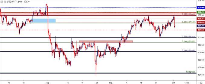 p-Also of interest for USD-weakness isUSD/JPY , and this also carries a risk aversion item of interest. The pair reacted to the support looked at last week around 107.00 and bounce all the way up to that same Fibonacci level that helped to set the September high at 108.47. This can keep downside in focus on USD/ JPY .USD/JPY Four-Hour Price Chart