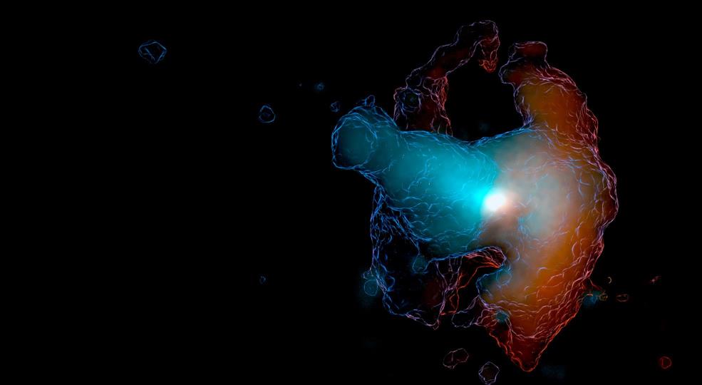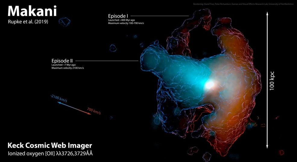 There's nothing paranormal going on here though. From the colour, or frequency, of the light, we know it is being emitted by oxygen ions. Our analysis shows that the nebula has formed as the result of two distinct gas outflows – winds – that have propagated from the central galaxy into the CGM. We call the nebula Makani – a Hawaiian word for wind – out of respect for the cultural significance of the mountain from which the observations were made.