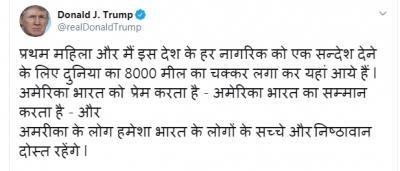 New Delhi, Feb 24 (IANS) US President Donald Trump put out a second tweet in Hindi shortly after leaving from Motera Stadium in Ahmedabad on Monday saying he and First Lady Melania Trump travelled all the way to India to deliver a special message to Indians.