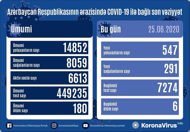 Azerbaijan has detected 547 new COVID-19 cases, 291 patients have recovered and six patients have died, Trend reports on June 25 citing the Operational Headquarters under Azerbaijani Cabinet of Ministers.