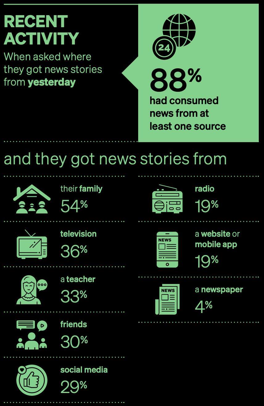 The day before the survey, 70% of young people received news from family, teachers or friends (up 13% from 2017), while 29% got their news from social media (up 7%).