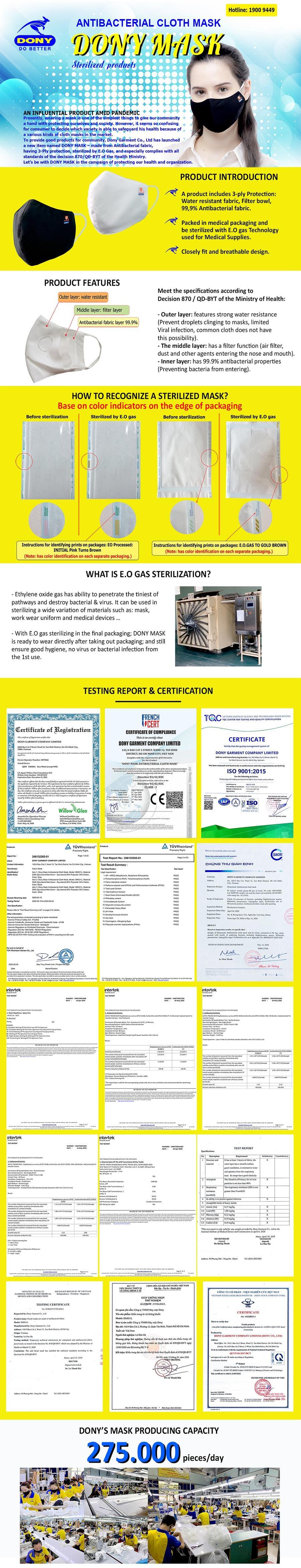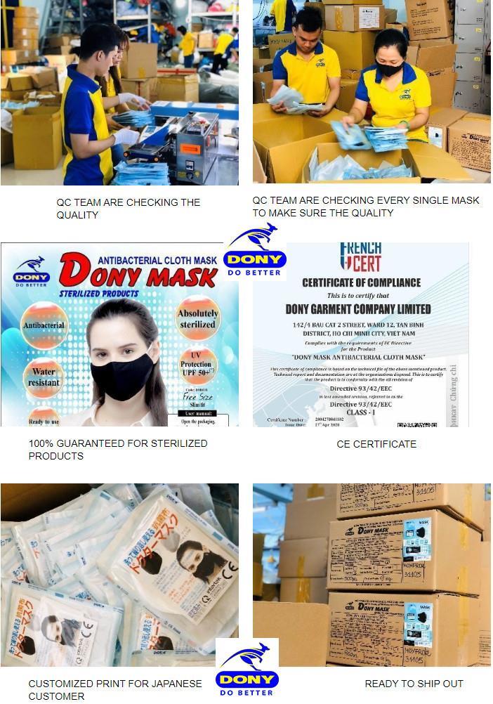 Dony cloth face masks are produced under the closed procedure Packing - Sealing - Sterilization. Therefore, our products meet all of the requirements of high-quality masks.