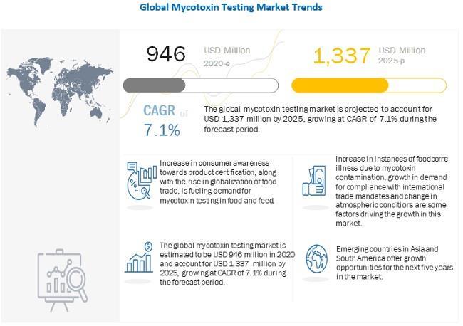 The report " Mycotoxin Testing Market by Type (Aflatoxins, Ochratoxin, Fumonisins, Zearalenone, deoxynivalenol, Trichothecenes, Patulin), Technology (Chromatography- & Spectroscopy-Based, Immunoassay-Based), Sample (Feed & Food), and Region - Global Forecast to 2025″ , published by MarketsandMarkets™, size is projected to reach USD 1,337 million by 2025, which was estimated at USD 946 million in 2020; it is expected to grow at a CAGR of 7.1% from 2020. The market is driven by factors such as implementation of stringent regulatory compliance on mycotoxin detecton, growth in international trade that will lead to increase in testing on both souring and destination place of the goods, and increasing consumers awareness for certification of products for different toxins and food & feed born mycotoxins. Also, rising humid atmospheric condition leading to an increase in mycotoxin has been driving the growth of this market.