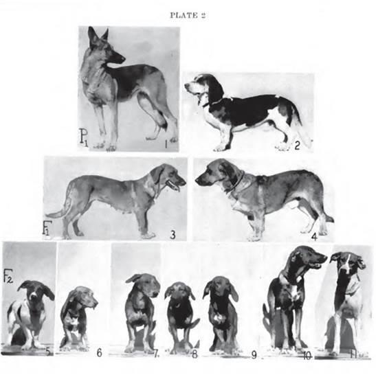 This time-honoured illustration shows how the first-generation offspring of two breeds is similar (all having exactly one-half of chromosomes from each parental breed), in contrast to the substantial variation in subsequent generations. M. Burns and M.N. Fraser (1966) , Author provided
