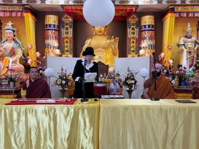 Chairperson Suzi Leggett handed the Pope of Buddhism Scepter to Venerable Mozhi Rinpoche, representative of World Buddhism Association Headquarters, for the Scepter to be returned to His Holiness Dorje Chang Buddha III.
