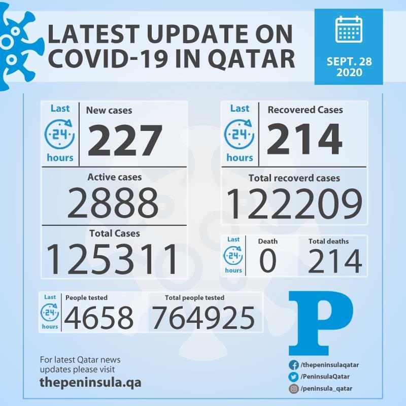 (MENAFN- The Peninsula) Doha: Ministry of Public Health (MoPH) today recorded 227 new cases of coronavirus (COVID-19) and 214 people recovered from the virus in the last 24 hours, bringing the total number of people recovered in Qatar to 122,209.