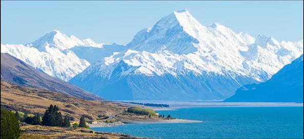 View of Mt Cook/Aoraki, rising 3724m above sea level at the head of Lake Pukaki in New Zealand's South Island. The mountain is underlain by crust about 45km thick. Shutterstock/yong922760 Rocky icebergs