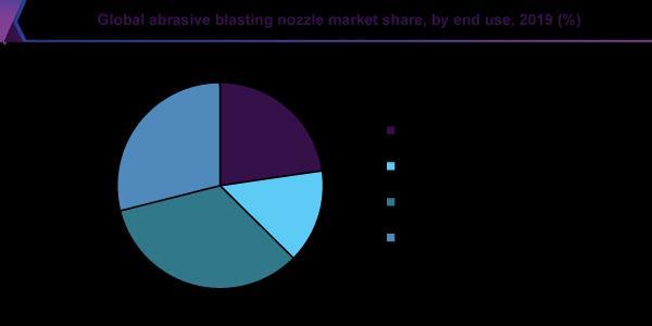 Abrasive blasting nozzles are being used for diverse applications as different types, such as venturi nozzles that offer high abrasive velocity, angled nozzles that are ideal for compact spaces, and straight bore nozzles that are suitable for close-range spot blasting, are introduced in the market. The ability to blast nozzles to ensure consistent surface finishing is expected to open significant opportunities in the market over the forecast period. For instance, blasting nozzles are increasingly being used for sandblasting operations on automobiles to strip-off paint, rust, grease, and oil.