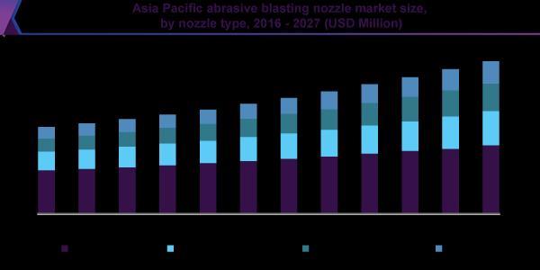 The global Abrasive Blasting Nozzle Market size is anticipated to reach USD 267.4 million by 2027, exhibiting a CAGR of 4.5% from 2020 to 2027, according to a new report by Grand View Research, Inc. The increasing adoption of abrasive blasting machines for cleaning, repairing, and surface finishing, among other applications, is expected to drive the market growth. Construction projects being aggressively pursued, particularly in developing economies, such as India and Brazil, are also expected to contribute to the growth.