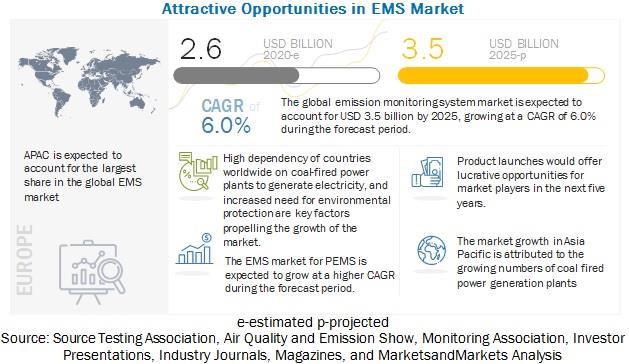 According to the new market research report ' Emission Monitoring System (EMS) Market with COVID-19 Impact Analysis, by System Type (CEMS, PEMS), Offering (Hardware, Software, Services), Industry (Power Generation, Oil & Gas, Chemicals, Petrochemicals), and Region - Global Forecast to 2025, The EMS market is projected to grow from USD 2.6 billion in 2020 to USD 3.5 billion by 2025; it is expected to grow at a CAGR of 6.0% from 2020 to 2025. The key factors fueling the growth of the market include high dependency of countries worldwide on coal-fired power plants to generate electricity, and stringent emission norms and standards enforced by North American and European governments. Additionally, increased need for environmental protection is also augmenting the growth of the EMS market.