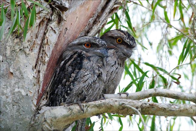 Although tawny frogmouths are often referred to as owls, they are not. But they do resemble owls with their large eyes, soft plumage and camouflage patterns, because both owls and frogmouths hunt at night. This phenomenon (where two species develop the same attributes, despite not being closely related) is called 'convergent evolution'.