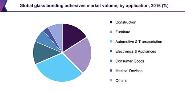 - In terms of revenue, electronics & appliances application in the glass glues industry is expected to rise at an estimated CAGR of 7.7% over the forecast period. This application segment constituted a revenue share of 12.7% in 2016.
