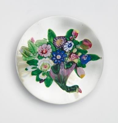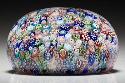 Incredibly, everything inside the weight is also glass: the flowers, the salamanders, the insects -- everything. Most of the weights in the Neustadter Collection, which was offered at Christie's in 2016, were made either using millefiori canes or lampwork. Millefiori or 'thousand flowers' canes are produced by layering molten glass into a pattern in a fat cylindrical shape, then pulling the cylinder to create an elongated pencil-thin rod. When the rod is sliced, the pattern can be seen in the cross section. Millefiori weights consist of many patterned canes, either packed closely together or in various other arrangements.