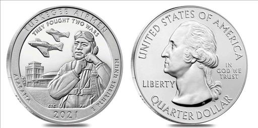 Last America The Beautiful Silver Quarter: 2021 Alabama Tuskegee Airmen National Historic Site coinThe America the Beautiful 5 oz silver quarters program began in 2010, and it comes to a grand end this first quarter! There are 56 total coins that make up the program. Each ATB coin released honors US national forests, parks, historic events, and locations. The release to close out the program is the Alabama Tuskegee Airmen National Historic Site Coin . Also made with 5 troy oz of .999 fine silver , the reverse of the coin displays an airman fastening his helmet while planes fly behind him. The obverse displays George Washington, which is the face of every US quarter.
