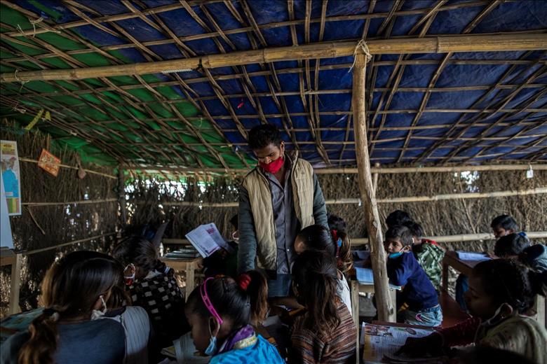An outdoor classroom set up in New Delhi, India, for the pandemic. Indian children learn a different kind of formal English than American children do. Anindito Mukherjee/Getty Images